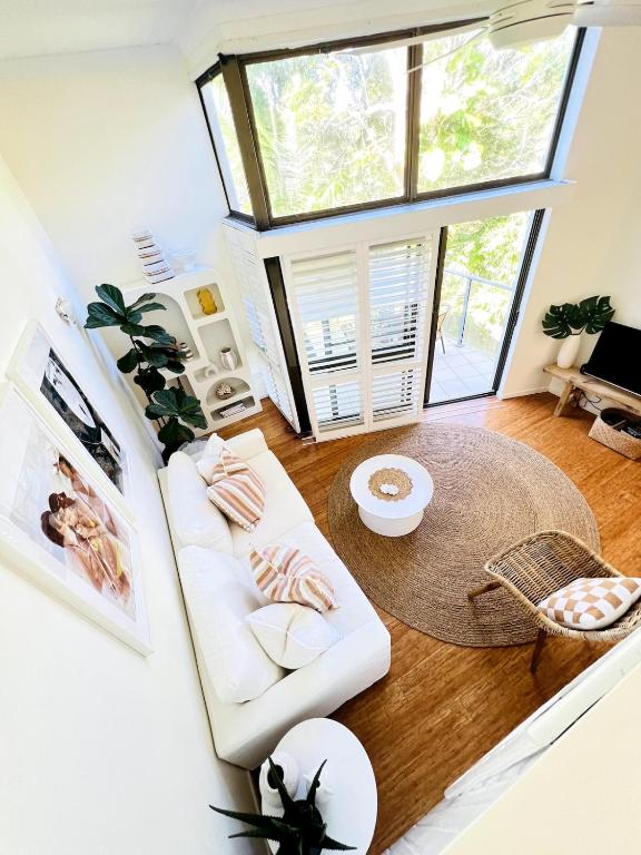 Designed with a unique architectural split-level layout, the townhouse offers an expansive sense of space and multiple curated “living zones.” Professionally styled with a chic “vacay” aesthetic, the interiors feature natural bamboo flooring, locally sourced artisan décor, and soaring vaulted ceilings that invite the sunlight to dance through the rooms.